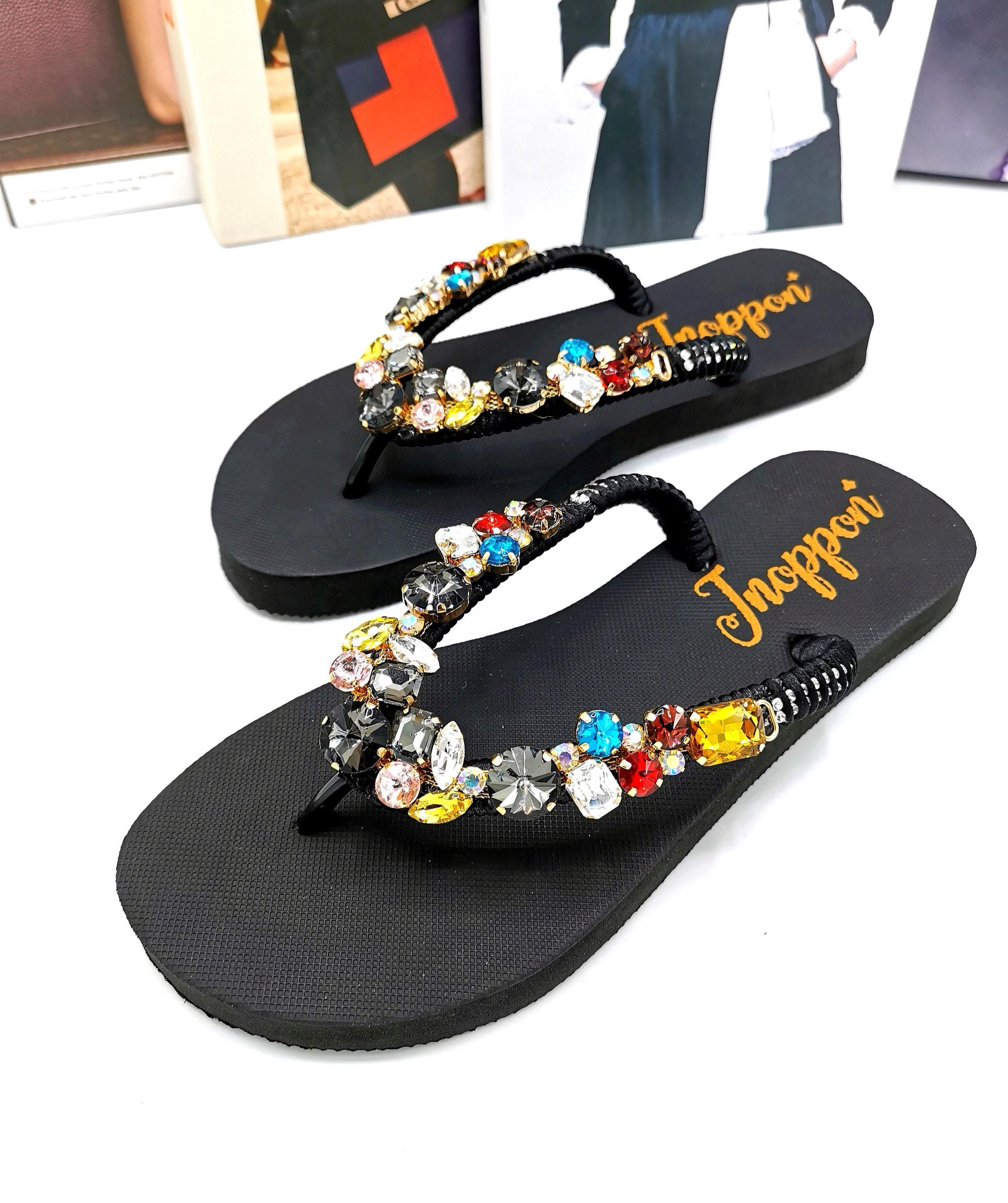 Indulge in the beauty of craftsmanship with these glamorous handmade rhinestone flip flops, featuring intricately hand-placed crystals in dazzling colors. With gold-tone wrapped straps and a comfortable rubber sole, these sandals combine elegance and ease — perfect for weddings, beach parties, resort wear, or simply elevating your everyday look.